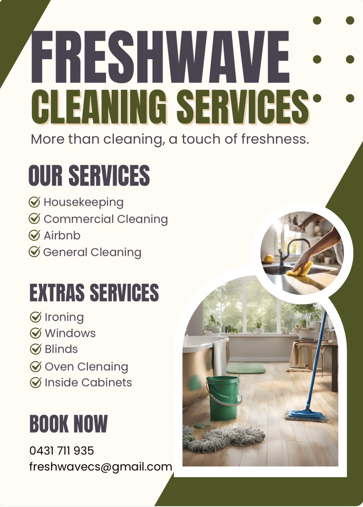 Freshwave Cleaning Services is a trusted cleaning company dedicated to delivering spotless, fresh and hygienic environments for homes, offices and commercial premises. Known for professionalism, consistent quality and a friendly approach, the team focuses on making every space look its best while ensuring a smooth, hassle-free experience for clients. Freshwave provides tailored cleaning solutions to match the needs of busy households, working professionals and businesses of all sizes.